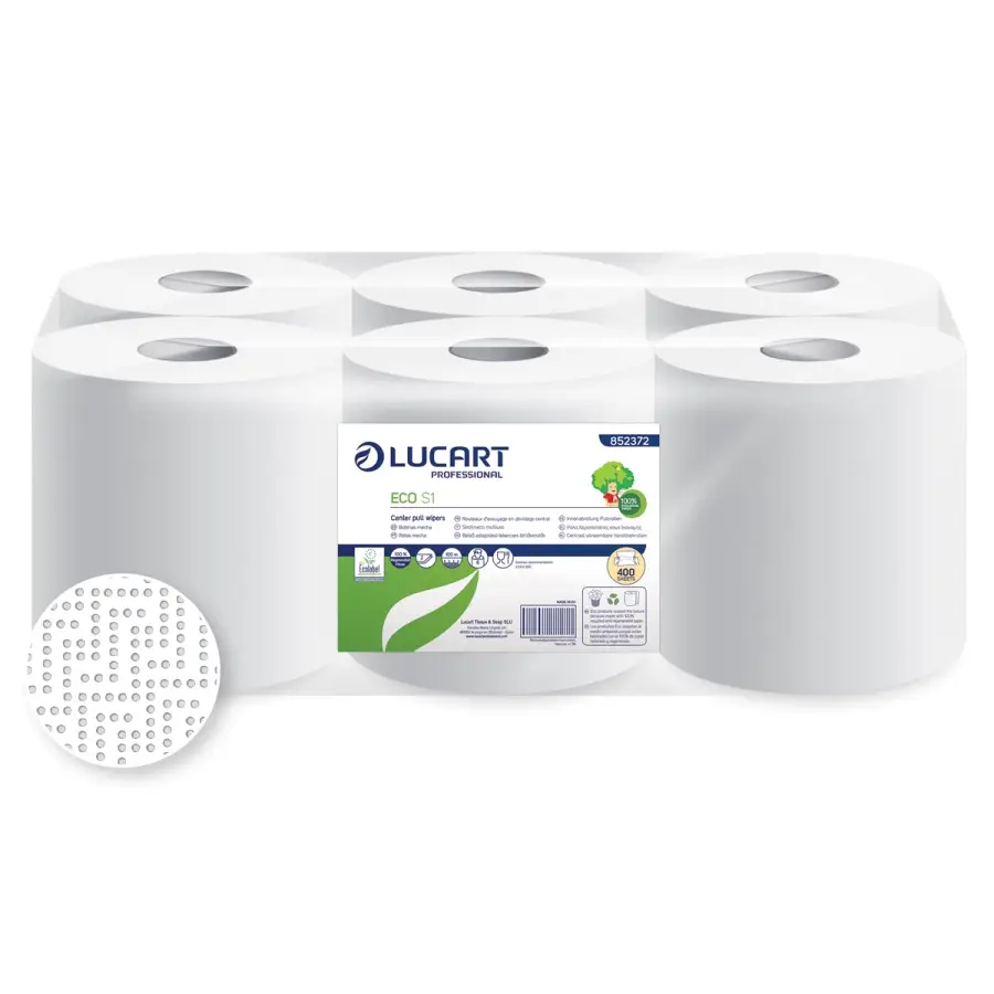 Bobina mecha ecológica de 2 capas, fabricada con fibras regeneradas. Alta capacidad de absorción, ideal para limpieza rápida y uso profesional.